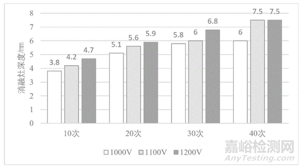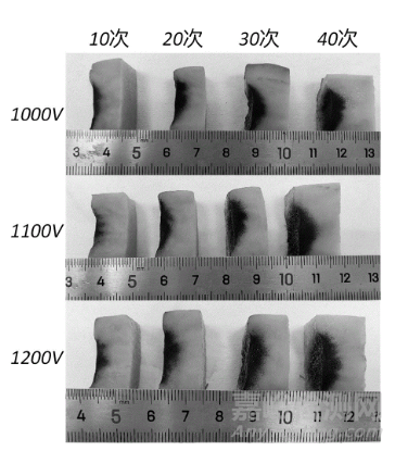 基于上圖的測(cè)試放電,不同放電電壓和放電次數(shù)下的土豆的消融灶深度的示意