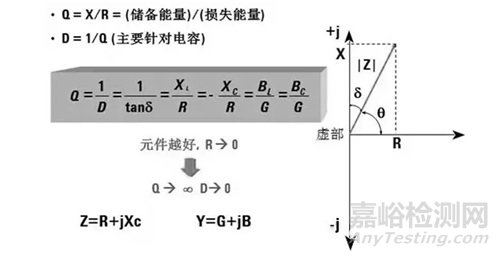 Q一般適用于電感器,對(duì)于電容器來(lái)說(shuō),表示純度的這一項(xiàng)通常用耗散因素(D)表示。耗散因素是Q的倒數(shù),它也是θ補(bǔ)角δ的正切。
