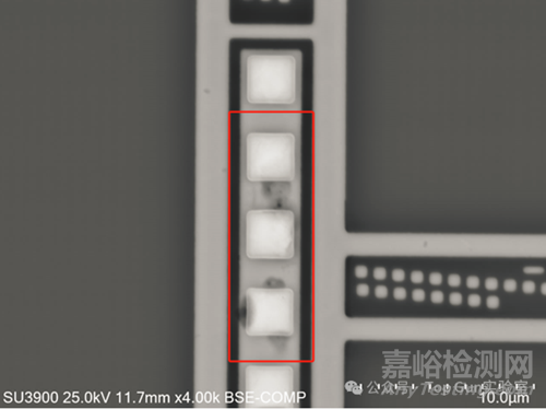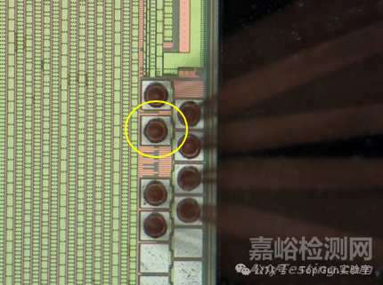 頂層金屬去層觀察:去除頂層后發(fā)現(xiàn)該P(yáng)ad往內(nèi)部電路走的過孔有疑似燒毀形貌。