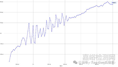 探針分別點在一焊點pad和外部引腳,進(jìn)行IV測試,pad對地開路、外部引腳對地開路、pad對外部引腳短路,從該測試結(jié)果可知,二焊點接觸良好,是芯片內(nèi)部發(fā)生了開路問題。開路的IV曲線如下圖所示。