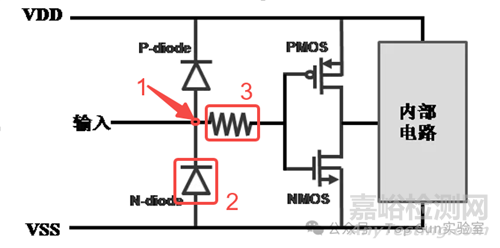 2)如果位置2燒開路,正常芯片表面會有燒毀形貌,甚至?xí)焰I合絲燒毀,且IV測試會走poly電阻過二級ESD保護(hù)電路,會有IV曲線,與目前的開蓋鏡檢和IV測試結(jié)果不符;