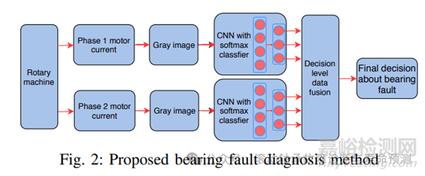 因此,本文提出了一種基于電機電流信號的故障診斷方法,該方法利用深度學習和信息融合技術,可應用于旋轉機械系統(tǒng)的外軸承故障診斷。該方法 ①采用來自電機電流的多個相位的原始信號作為直接輸入,從每個相位的電流信號中提取特征。②然后用卷積神經(jīng)網(wǎng)絡對每個特征集進行分類。③為了提高分類精度,引入了一種新的決策級信息融合技術,將所有卷積神經(jīng)網(wǎng)絡的信息融合在一起。④將決策級信息融合問題轉化為簡單的模式分類任務,通過熟悉的監(jiān)督學習算法即可有效解決。⑤通過對實際軸承故障信號的實驗,驗證了所提故障診斷方法的有效性。