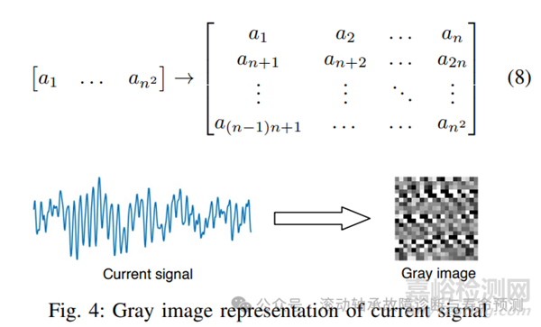 原始測量信號為一維(1−D)形式。為了便于用2−D CNN處理,這些信號通過簡單地將信號幅度陣列重新排列成方陣形式而轉換為2−D形式。假設將每個信號樣本表示為幅度為1 × n²的數(shù)組,則變換結果為n × n矩陣,如式8所示: