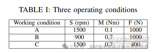 軸承缺陷是通過加速壽命試驗得到的真實損傷。試驗臺上使用了三種類型的滾珠軸承:外滾圈故障軸承、內滾圈故障軸承和健康軸承。通過改變電機的轉速(S)、負載電機的負載轉矩(M)和作用在測試軸承上的徑向力(F),可以改變試驗臺的操作。軸承上的徑向力、扭矩測量軸上的負載轉矩、軸承模塊內的轉速和油溫與電機電流和振動信號同步測量。