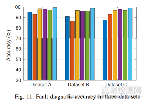 為了更深入地評價所提出的軸承故障診斷方法,我們考慮了另外三種試驗臺的運行條件。數(shù)據(jù)集A、B、C分別來自于表1所示的三種工況,在之前的實驗中使用的是工況1對應的數(shù)據(jù)集A。然后,我們對數(shù)據(jù)集B和c進行了相同的實驗。實驗結果如圖11和表VI所示。