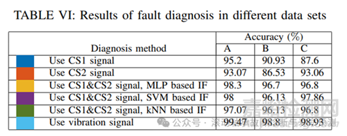 可以看出,在基于電流信號的方法中,如果單獨使用單個電流1相或2相,故障檢測精度較低。然而,如果使用中頻技術合并當前信號的兩相信息,則精度顯著提高。與精度高達99:47%的基于振動信號的方法相比,該方法的性能略低。