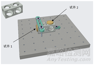 本文航天器組件專用異型工裝及安裝方式的三維模型如圖1。根據(jù)組件實(shí)際安裝相對(duì)位置,工裝側(cè)面和頂面各安裝1個(gè)模擬件,由于無預(yù)留安裝孔,采用螺栓、壓塊、墊塊壓緊安裝固定。