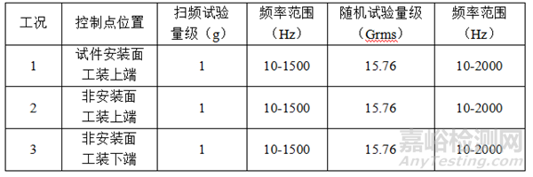 試件選用模擬件,并分別在2個(gè)試件上布置傳感器作為監(jiān)測點(diǎn)采集試件響應(yīng)數(shù)據(jù)。控制方式采用雙點(diǎn)平均控制,控制傳感器位置依次布置在工裝上端試件安裝面、工裝上端非試件安裝面、工裝下端非試件安裝面3種方案。各位置依次開展固定量級(jí)的正弦特征掃頻和隨機(jī)試驗(yàn),試驗(yàn)矩陣如下表1。