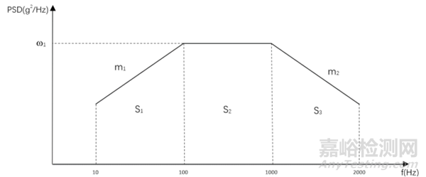 圖中包含上升譜(S1)、平直譜(S2)和下降譜(S3),上升段和下降段的斜率分別為m1和m2,平直段的PSD值為ω1,加速度總均方根值指功率譜密度的頻譜在全頻段范圍內(nèi)面積的積分開根號(hào)值,即三個(gè)譜面積和的開方值。