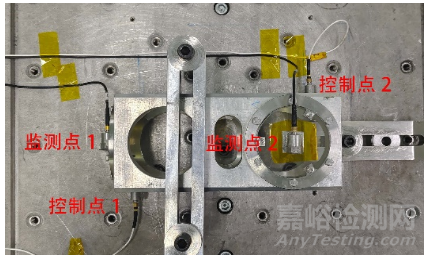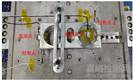 將工裝與振動(dòng)臺(tái)面連接緊固,根據(jù)組件實(shí)際安裝位置,將兩個(gè)模擬件分別安裝在工裝上表面和側(cè)面。根據(jù)表1中工況1,模擬件表面粘貼傳感器作為監(jiān)測點(diǎn)1、監(jiān)測點(diǎn)2,模擬件安裝面上端,產(chǎn)品連接螺栓附近位置粘貼傳感器作為控制點(diǎn)1、控制點(diǎn)2,試驗(yàn)系統(tǒng)布置如圖3。完成試驗(yàn)前準(zhǔn)備及多余物檢查工作后,開始振動(dòng)試驗(yàn)。