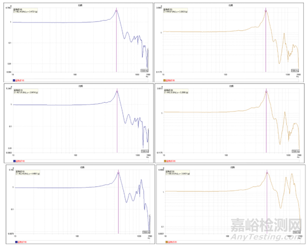 試驗(yàn)設(shè)計(jì)中,首先進(jìn)行正弦特征掃頻,通常采用較小量級(jí)進(jìn)行,目的是獲取試件的動(dòng)力學(xué)特性,在掃頻試驗(yàn)的監(jiān)測點(diǎn)響應(yīng)頻域曲線中,可以獲取試件的一階固有頻率(基頻),對(duì)應(yīng)曲線中縱軸坐標(biāo)(加速度,單位g)的第一個(gè)峰值。對(duì)比矩陣不同工況下的峰值大小,可作為判定控制效果的一項(xiàng)判據(jù)。