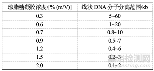 表1 不同含量標(biāo)準(zhǔn)低電內(nèi)滲瓊脂糖凝膠的分離范圍