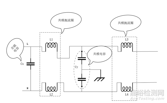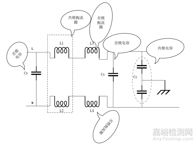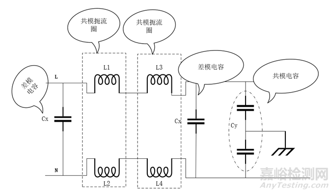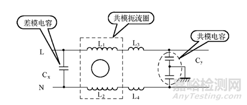 如果把該濾波器一端接入干擾源, 負(fù)載端接被干擾設(shè)備, 那么L1 和Cy (電路結(jié)構(gòu)形如Y,所以被稱為Y電容), L2 和Cy 就分別構(gòu) 成L—E和N—E兩對(duì)獨(dú)立端口間的低通濾波器。