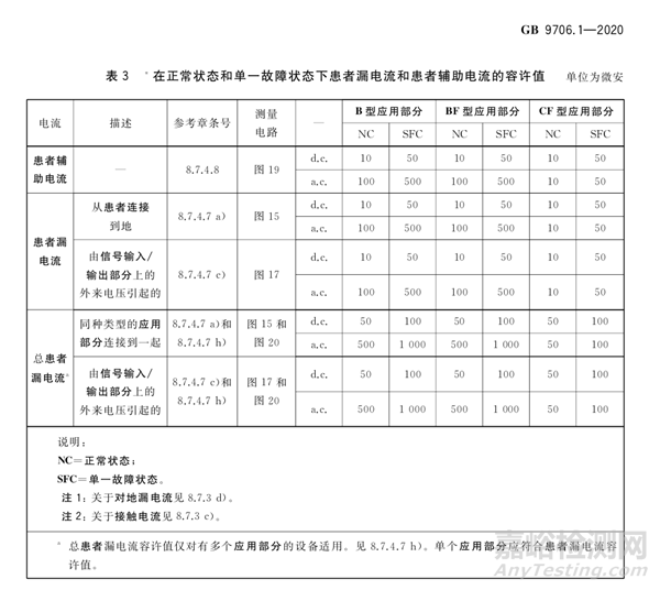 如下表格為醫(yī)療法規(guī)GB 9706.1-2020 醫(yī)用電氣設(shè)備 第1部分:基本安全和基本性能的通用要求中對(duì)患者漏電流的要求容許值: