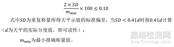 使用單一砝碼進行測試,砝碼的標稱質(zhì)量通常應不大于電子天平最大秤量的5%,當該值小于 100mg 時,可使用 100mg 的砝碼進行測試。將天平置零,砝碼放置于天平稱量盤中心位置并記錄示值,重復該步驟至少 10 次。先計算示值的標準偏差,然后按下述公式計算,如果公式成立則重復性滿足要求: