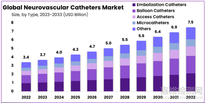 市場(chǎng)規(guī)模與增長(zhǎng):預(yù)計(jì)到2033年,神經(jīng)血管導(dǎo)管市場(chǎng)將達(dá)到約75億美元的規(guī)模,從2023年的34億美元起算,復(fù)合年增長(zhǎng)率(CAGR)為8.2%。