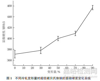不同冷軋變形量時超低碳貝氏體鋼的顯微硬度變化曲線如圖1所示。由圖1可知:未變形時,鋼的顯微硬度為371HV,當冷軋變形量增大到90%時,鋼的硬度增大到457HV??傮w來說,隨著變形量的增大,鋼的顯微硬度增大。