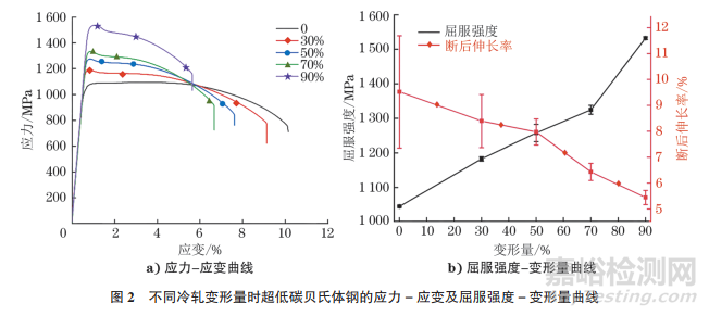 不同冷軋變形量時超低碳貝氏體鋼的應力-應變及屈服強度-變形量曲線如圖2所示。由圖2可知:隨著冷軋變形量的增大,超低碳貝氏體鋼的強度增大,而斷后伸長率減?。晃醋冃螘r,超低碳貝氏體鋼的抗拉強度為1046MPa,斷后伸長率為11.05%;當變形量分別為30%,50%,70%,90%時,鋼的抗拉強度分別增大為1178,1274,1335,1534MPa,而斷后伸長率分別減小到9.12%,7.61%,6.67%,5.64%。由強度、硬度與冷變形的關系可知,隨著冷軋變形量的增大,強度與硬度均呈增大趨勢,這是由形變強化與邊界強化效應引起的。