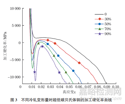 為了詳細研究不同冷軋變形量下超低碳貝氏體鋼的加工硬化特性,根據(jù)拉伸應力-應變曲線計算出加工硬化率曲線,結果如圖3所示。由圖3可知:不同變形量下,加工硬化率的變化主要經(jīng)歷3個階段。第1階段,加工硬化率隨應變的增大迅速降低;第2階段,加工硬化率曲線出現(xiàn)第1 個拐點,數(shù)值隨真應變的增大有小幅度上升趨勢;第3階段,加工硬化率曲線的第2個拐點出現(xiàn),加工硬化率隨著真應變的增大再次下降,直至材料斷裂,但下降速率小于第1階段。隨著變形量的增大,超低碳貝氏體鋼的屈服點向更大的應力移動,鋼的塑性應變由未變形時的0.088減小到變形量為90%時的0.045。