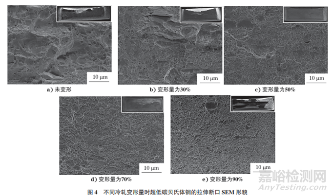 不同冷軋變形量時超低碳貝氏體鋼的拉伸斷口SEM形貌如圖4所示。由圖4可知:未變形時,斷口呈韌窩和剪切唇混合形貌,韌窩長度較長且相對較深,韌窩長度約為2.97μm,斷裂方式為韌性斷裂;隨著變形量的增大,韌窩尺寸減小,且深度減?。划斪冃瘟糠謩e為30%,50%,70%,90%時,韌窩的平均長度分別為1.52,1.45,1.23,0.92μm。綜上可知,隨著冷軋變形量的增大,斷口中韌窩的數(shù)量逐漸增多,尺寸減小,深度變淺,但斷裂方式仍為韌性斷裂。