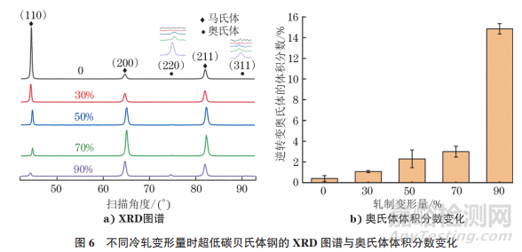 采用X射線衍射儀與X射線應力儀對不同變形量下的超低碳貝氏體鋼中的奧氏體含量進行測量。不同冷軋變形量時超低碳貝氏體鋼的XRD圖譜與奧氏體體積分數(shù)變化如圖6所示。由圖6可知:未變形時,XRD圖譜顯示超低碳貝氏體鋼中只有體心立方結構 (BCC) 的貝氏體;隨著變形量的增大,面心立方結構 (FCC) 的(220)γ、(311)γ衍射峰強度逐漸增大。由X射線應力儀測得的奧氏體含量可知,隨著變形量的增大,超低碳貝氏體鋼中的奧氏體體積分數(shù)逐漸增大。未變形時,奧氏體體積分數(shù)為0.40%,當變形量逐漸增大至90%時,奧氏體體積分數(shù)逐漸增大至14.85%??梢姡谠摶鼗鸸に囅?,冷變形有利于促進超低碳貝氏體鋼中逆轉變奧氏體的轉變。