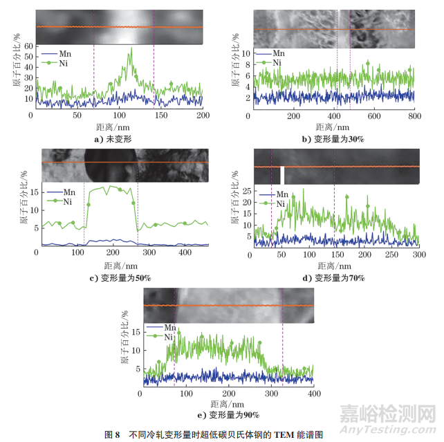 不同冷軋變形量時超低碳貝氏體鋼的TEM能譜圖如圖8所示。由圖8可知:未變形時,殘余奧氏體中Ni元素和Mn元素的原子百分數(shù)分別約為59%和16%,遠高于基體,但是殘余奧氏體體積分數(shù)較?。划斪冃瘟繛?0%時,逆轉變奧氏體中Ni元素和Mn元素的原子百分數(shù)與基體相差不大,這是因為逆轉變奧氏體剛開始由板條狀貝氏體轉變而成,其與基體中Ni、Mn元素的原子百分數(shù)差別并不大;當變形量為50%時,逆轉變奧氏體中的Ni、Mn元素的原子百分數(shù)分別上升到16.84%和1.32%;當變形量為70% 時,Ni、Mn元素的原子百分數(shù)分別為18.48%和4.78%;當變形量為90%時,Ni、Mn元素的原子百分數(shù)分別為11.64%和3.48%。