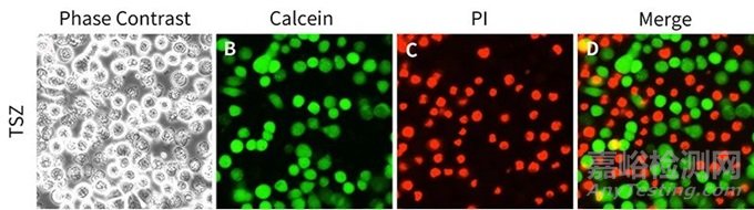 通過同時觀察Calcein的綠色熒光和PI的紅色熒光,可以區(qū)分出三種細胞狀態(tài):活著的細胞(只有綠色熒光),死亡的細胞(只有紅色熒光),以及受損但仍存活的細胞(同時有綠色和紅色熒光)。根據(jù)熒光信號的強弱和分布,可以定量和分析不同條件下細胞的存活率和毒性程度,從而評估藥物的毒性、細胞培養(yǎng)的質(zhì)量以及其他相關(guān)的生物學(xué)研究問題。