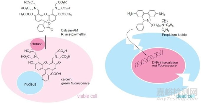 Calcein-AM是一種脂溶性的非熒光染料,可以穿過完整的細胞膜進入細胞內(nèi)部。在細胞內(nèi),Calcein-AM會被細胞內(nèi)的酯酶水解成為高度熒光的Calcein。只有活著的細胞才能將Calcein-AM水解成Calcein,因此高熒光信號表明細胞的代謝活性和細胞膜完整性良好。而PI是一種核酸染料,只有在細胞膜受損時才能進入細胞內(nèi)結(jié)合DNA并發(fā)出紅色熒光。因此,當細胞膜受損時,PI會進入細胞并與DNA結(jié)合,發(fā)出紅色熒光信號。