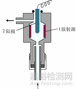 利用放射性同位素在衰變過程中放射的具有一定能量的β-粒子作為電離源。當(dāng)載氣分子通過離子源時,β射線與載氣分子作用產(chǎn)生電子,具有親電基團的試樣分子能捕獲慢電子而變成負離子,這種負離子能與載氣受放射粒子所產(chǎn)生的正離子復(fù)合,從而改變檢測器的基流,使之減少,輸出一個負極性的電信號。