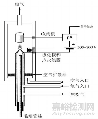 含碳有機物在氫火焰中燃燒時,產(chǎn)生化學(xué)電離,在極化電壓作用下,正離子被收集到負電極上,產(chǎn)生電流,對這個電流信號進行檢測和記錄即可得到相應(yīng)的譜圖。