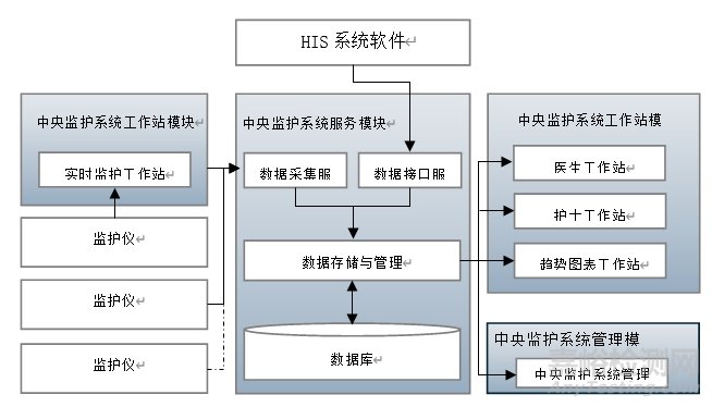 中央監(jiān)護(hù)軟件一般由“中央監(jiān)護(hù)系統(tǒng)服務(wù)模塊、中央監(jiān)護(hù)系統(tǒng)工作站模塊、中央監(jiān)護(hù)系統(tǒng)管理模塊”組成: