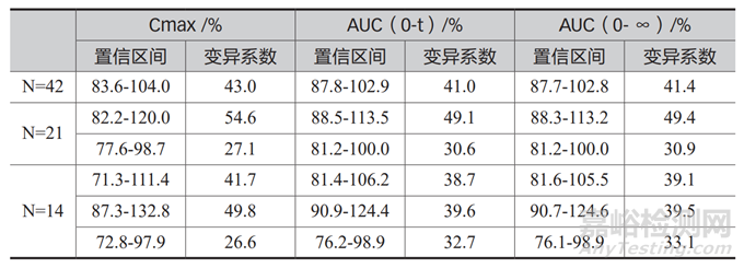 采用兩周期交叉試驗設(shè)計法對同一批參比制劑進(jìn)行生物等效性試驗研究,在 N=42 的條件下,主要藥代動力學(xué)參數(shù) Cmax、AUC(0-t)、AUC(0- ∞)幾何均值比值的 90% 置信區(qū)間數(shù)值符合要求;按照隨機(jī)號順序分為 2 組,即N=21 的條件下,出現(xiàn)了第一組(1 ~ 21號)等效,第二組(22 ~ 42)不等效的情形;按照隨機(jī)號順序分為 2 組,即N=14 的條件下,三組結(jié)果均不等效。因此,采用兩周期交叉試驗進(jìn)行生物等效性預(yù)試驗研究獲得體內(nèi)變異系數(shù)進(jìn)行正式生物等效性樣本量估計以及臨床研究方案設(shè)計,存在較大的風(fēng)險。