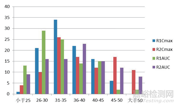 在采用 2×12 的模擬預(yù)試驗的方式進(jìn)行模擬計算的結(jié)果顯示同一個參比制劑其 CVW 值分別在 22.7% ~ 49.7%(R1,Cmax)、17.7% ~ 64.8%(R2,Cmax) 和 17.6% ~ 51.4%(R1,AUC)、19.1% ~ 58.3%(R2,AUC)這樣一個比較寬泛的內(nèi)波動,統(tǒng)計這些數(shù)字在不同區(qū)間內(nèi)出現(xiàn)的頻次見圖 1。從圖可見,CVW 值在 26% ~ 50% 之間的分布相對而言在各個區(qū)間沒有太明顯的區(qū)別,同一個參比制劑分別按照 R1 和 R2 來進(jìn)行統(tǒng)計的的結(jié)果還是有一定的差異的,這充分的說明了預(yù)試驗所取得的CVW 值除了在個別的區(qū)間內(nèi)出現(xiàn)的幾率略高一些外,在很寬的一個范圍內(nèi)出現(xiàn)的幾率相差并不大。并且,模擬預(yù)試驗的計算結(jié)果中出現(xiàn)了相當(dāng)一部分(最少的有 14 次)的 CVW 值是小于 30%的這樣的結(jié)果,這進(jìn)一步提示了我們預(yù)試驗的結(jié)果很難用于對正式試驗的CVW 值的預(yù)測,因此,用這樣的結(jié)果來預(yù)測正式試驗的例數(shù)是不可靠的。