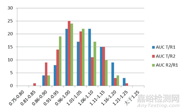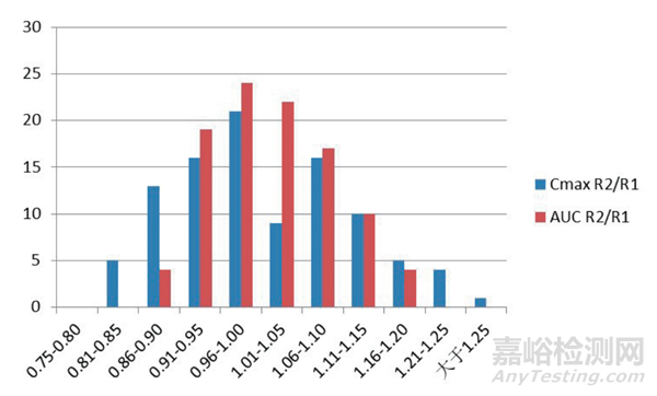 圖4 參比制劑/受試制劑藥代動力學(xué)參數(shù)(AUC)幾何平均值概率分布圖
