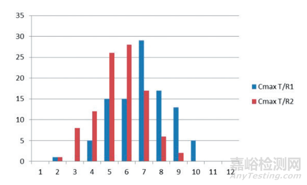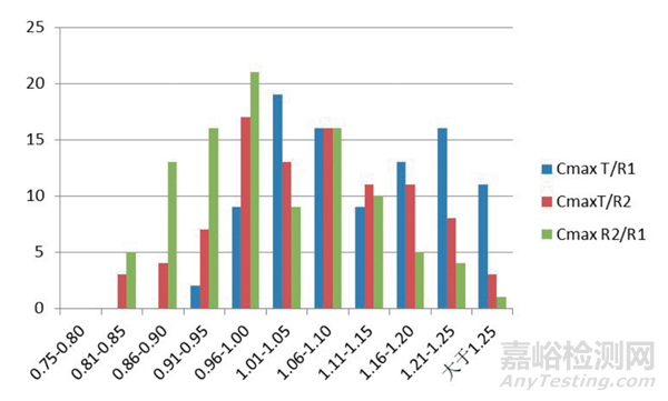圖3 參比制劑/受試制劑藥代動力學(xué)參數(shù)(Cmax)幾何平均值概率分布圖