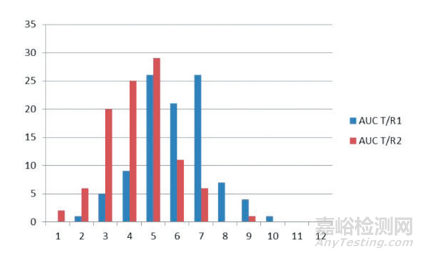 我們參考 Isabel Moreno 等人證明最有效的 12 個受試者單次給藥雙交叉的模擬預(yù)試驗設(shè)計,按照預(yù)試驗的結(jié)果來分別計算對正式試驗入組例數(shù)估算最重要的兩個因素變異系數(shù) CV 值和幾何均值[4]。尤其通過調(diào)查是同一個參比制劑在預(yù)試驗中的 CV 值和幾何均值的分布范圍,進(jìn)而了解如果參比制劑和受試制劑如果在藥學(xué)上非常接近,預(yù)試驗是否能很好地預(yù)測正式試驗的結(jié)果和正式試驗需要的受試者例數(shù)。同時,也考察對于AUC的變異也超出30%的情形下,預(yù)試驗是否能夠很好地預(yù)測 AUC 的比值。