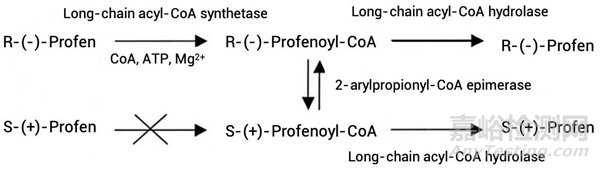 手性反轉(zhuǎn)有方向性,大多是單向,少數(shù)是雙向。2-芳基丙酸類非甾體抗炎藥是容易發(fā)生手性反轉(zhuǎn)的一類藥物。以布洛芬為例,R-型布洛芬可以轉(zhuǎn)化為S-型布洛芬,但S型不能轉(zhuǎn)化為R型[6]。S型布洛芬是布洛芬中主要起藥效的對映異構(gòu)體,它可以以更低的劑量獲得和外消旋布洛芬相當(dāng)?shù)寞熜А?/span>