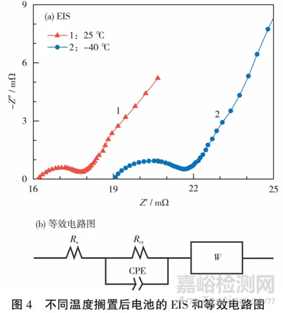 在低溫擱置后,電池的阻抗上升,Rs增長率為16.18%,Rct也明顯增大。這是因為低溫降低了電池內(nèi)部的化學反應速率,使Li+的嵌脫受阻,導致電池阻抗增大。