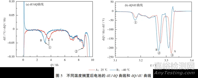 dU/dQ曲線主要反映活性物質(zhì)在Li+ 嵌脫過程中的相變,特征峰之間的距離可衡量活性材料在某相狀態(tài)下的最大鋰嵌脫量。從圖5(a)可知,電池的dU/dQ曲線有2個明顯的特征峰:特征峰①代表負極的相變;特征峰②代表正極和負極的共同作用。與對照組相比,-40℃擱置后的電池,特征峰①向低容量方向偏移,電壓平臺減小,表明電極活性材料有損失,此外,特征峰①還出現(xiàn)銳化現(xiàn)象,表明有活性Li+的損失,銳化程度取決于電極中活性Li+的含量。綜上所述,活性物質(zhì)和活性Li+的損失,導致了電池容量衰減。特征峰②可能是由于鋰消耗的副反應,產(chǎn)生了低容量方向的偏移。