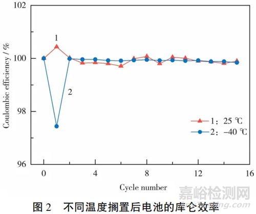 為進一步探究低溫擱置對電池放電能力的影響,通過式(2)計算得到低溫擱置后的電池庫侖效率,如圖2所示。