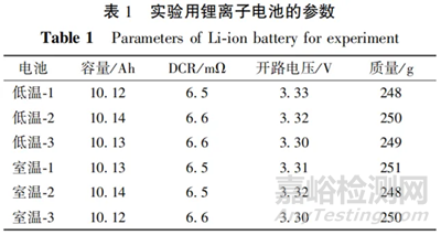 實驗前,各樣品先進行恒流-恒壓(CC-CV)充電,即以1.00C充電至3.65V,轉(zhuǎn)恒壓充電至0.05C,再進行1.00C恒流(CC)放電至2.30V,循環(huán)3次,以評估電池的實際可用容量,并篩選出一致性較好[放電容量差異在±0.1Ah以內(nèi),直流內(nèi)阻(DCR)差異在±3mΩ以內(nèi)]的6只電池,分成低溫實驗組和常溫對照組。上述充放電均在室溫下進行。用 電池內(nèi)阻測試儀分別夾到對應的電池正負極極耳,測量100%荷電狀態(tài)(SOC)電池的DCR。