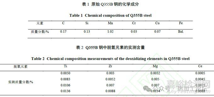 其中,關(guān)于Q355B鋼脫氧元素的添加量可參考如下范圍:Ti元素添加量高于0.010wt.%;Zr元素添加量高于0.0052wt.%,低于0.0088wt.%;Mg元素添加量可選擇0.0032wt.%;Ce元素添加量可選擇0.0071~0.0088 wt.%。為了進(jìn)一步提高脫氧元素對(duì)鋼中夾雜物的細(xì)化和穩(wěn)定化效果,在后續(xù)工作中,可以在上述工作基礎(chǔ)上,充分對(duì)比多元素復(fù)合脫氧對(duì)鋼中夾雜物形態(tài)及成分的影響,以進(jìn)一步細(xì)化顯微組織,優(yōu)化鋼材性能。
