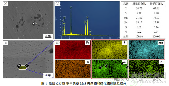 同時(shí),未脫氧鋼的基體中彌散分布著尺寸小于0.5μm的碳化物顆粒,其形貌和關(guān)鍵元素分布如圖1(c)、(d)所示。該碳化物在Q355B 鋼中普遍存在,襯度為黑色。EDS 分析表明碳化物周圍深灰色襯度區(qū)域存在Mn 和S 元素富集。這表明,部分碳化物與球狀MnS 共存,這些碳化物可能為MnS 夾雜的形成提供了形核質(zhì)點(diǎn)。