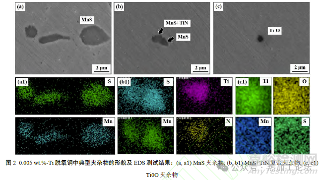 由于Ti元素添加量較少,且脫氧時(shí)間僅為2min,含Ti夾雜物的尺寸仍較小。一部分含Ti氧化物單獨(dú)存在,另一部分含Ti夾雜物與MnS夾雜依附存在。在Q355B鋼的精煉過程中,0.005 wt.%-Ti 短時(shí)間脫氧所產(chǎn)生的含Ti夾雜物即會(huì)影響MnS 的分布和形態(tài),對(duì)MnS 的細(xì)化表現(xiàn)出一定的積極作用。