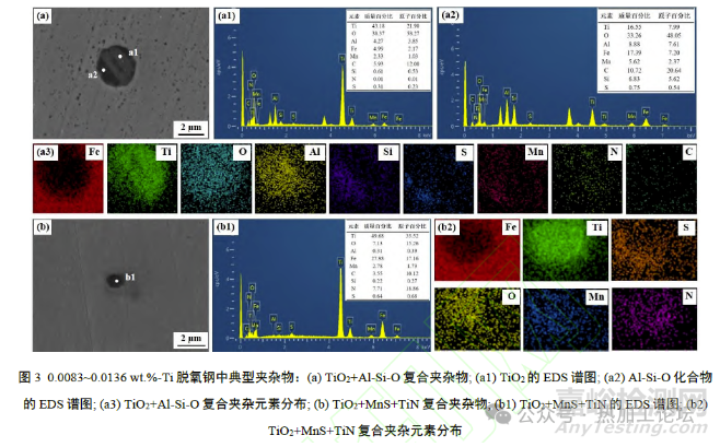 隨著Ti元素的質(zhì)量分?jǐn)?shù)逐漸增加(由0.0083 wt.%增加至0.0136 wt.%),除上述夾雜物,鋼中還出現(xiàn)了Ti-O化合物(以TiO2為主)與Al-Si-O化合物(硅酸鹽類)或MnS、MnS/MnO+TiN 的復(fù)合夾雜,如圖3 所示??梢钥闯觯珹l-Si的氧化物與Ti 的氧化物形成的復(fù)合夾雜尺寸一般可超過2μm。而含Mn 夾雜物與Ti的氧化物形成的復(fù)合夾雜尺寸較小,直徑約0.5~1μm,且隨著Ti元素添加量的增加,其尺寸保持穩(wěn)定??梢?,適當(dāng)提高Ti 元素的添加量,可充分發(fā)揮Ti的脫氧作用,其產(chǎn)物對(duì)于MnS、MnS/MnO+TiN夾雜有明顯的細(xì)化和穩(wěn)定作用。
