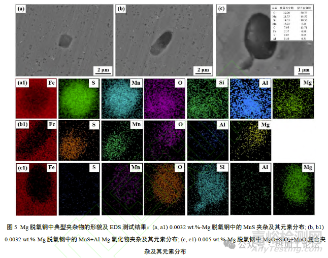 當(dāng)使用0.0032wt.%-Mg元素脫氧時(shí),可在部分塊狀MnS夾雜物內(nèi)部觀察到O、Si、Al和Mg元素的偏聚,但未觀察到氧化物顆粒與MnS的襯度區(qū)別,如圖5(a)、(a1)所示。在一些棒狀?yuàn)A雜物中,可觀察到兩種明顯的襯度,如圖5(b)所示。此夾雜物長(zhǎng)軸方向尺寸約為4μm,短軸方向?yàn)?.5μm。其左下方為MnS,該區(qū)域僅存在Mn和S元素的聚集,而在右上部深灰色襯度區(qū)域,可以觀察到O、Al和Mg元素的聚集,如圖5(b1)所示。可以判斷,此夾雜為鎂鋁尖晶石與MnS 的復(fù)合夾雜。