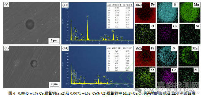 隨著Ce元素的添加量進(jìn)一步增加至0.0071~0.0088wt.%,脫氧鋼中的復(fù)合夾雜物尺寸比較穩(wěn)定,以1μm為主。由圖6(b-b2)可知,此夾雜物的心部為Ce2O3和少量SiO2,外面包裹著MnS,其中Ce2O3的襯度清晰,呈現(xiàn)為淺灰色。可見,Ce2O3對(duì)于MnS的尺寸有較好的穩(wěn)定作用,應(yīng)控制Ce元素的添加量達(dá)到0.0071wt.%。