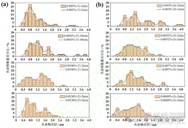 由圖7(b)可知, Zr 添加量為0.003~0.009 wt.%時(shí),脫氧鋼中夾雜物的尺寸相對(duì)于Ti 元素脫氧時(shí)的尺寸有所增加,且同樣表現(xiàn)出隨著脫氧元素添加量增加夾雜物尺寸減小的趨勢(shì)。整體來說,夾雜物尺寸的穩(wěn)定性較高,尤其當(dāng)Zr元素添加量達(dá)到0.0052wt.%時(shí),超過65%的夾雜物尺寸分布于0.8~1.6μm。
