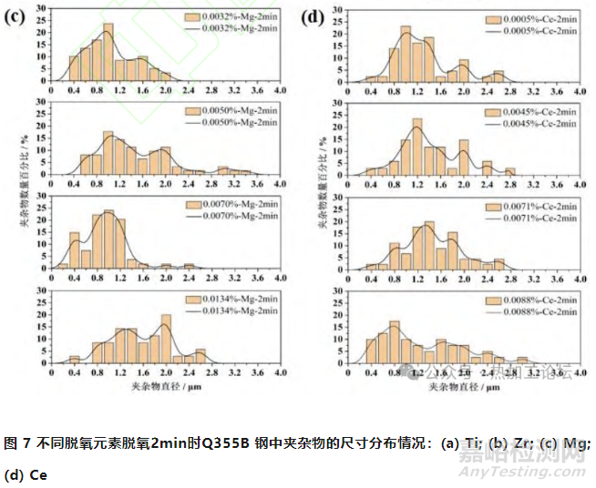 如圖7(c)所示,當(dāng)使用0.0032wt.%的Mg元素脫氧2min時(shí),夾雜物比較細(xì)小,尺寸為0.4~1 μm 的夾雜物占比超過50%。隨著Mg元素添加量的增加,夾雜物尺寸呈增大趨勢(shì),但當(dāng)Mg元素的添加量為0.007wt.%時(shí),尺寸分布于0.6~1.2 μm 的夾雜物占比接近70%。