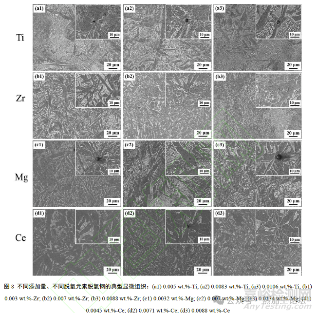 圖8(a1-a3)為不同含量Ti元素脫氧10min時(shí)Q355B鋼的顯微組織。當(dāng)Ti 含量為0.005 wt.%時(shí),組織主要由仿晶界鐵素體、塊狀鐵素體、針狀鐵素體及貝氏體組成;隨Ti 元素含量提高,仿晶界鐵素體含量逐漸減少;當(dāng)Ti 含量達(dá)到0.0106 wt.%時(shí),仿晶界鐵素體完全消失,且針狀鐵素體含量逐漸增加,有利于提升沖擊韌性。圖8(b1-b3)為不同含量Zr 元素脫氧10 min 時(shí)Q355B 鋼的顯微組織。當(dāng)Zr 含量為0.003wt.%時(shí),組織主要由塊狀鐵素體、針狀鐵素體及貝氏體組成,無明顯邊界;Zr含量提高至0.007wt.%時(shí),組織稍細(xì)化,物相構(gòu)成及含量變化不大;Zr含量為0.0088wt.%時(shí),組織明顯細(xì)化且貝氏體含量顯著增加,而針狀鐵素體含量顯著下降,且組織均勻性變差,進(jìn)而導(dǎo)致沖擊韌性惡化。圖8(c1-c3)為不同含量Mg 元素脫氧10min 時(shí)Q355B 鋼的顯微組織。當(dāng)Mg含量為0.0032 wt.%時(shí),組織主要由多邊形鐵素體、針狀鐵素體及貝氏體組成,其中貝氏體含量約20 wt.%;當(dāng)Mg含量為0.007 wt.%時(shí),組織均勻性較差,且貝氏體含量顯著增加;當(dāng)Mg含量為0.0134 wt.%時(shí),組織重新變得均勻。因此,為了有效細(xì)化組織,得到較多的針狀鐵素體并且降低成本,Mg添加量以不超過0.007wt.%為宜。圖8(d1-d3)為不同含量Ce元素脫氧10 min 時(shí)Q355B 鋼的顯微組織。組織均主要由針狀鐵素體及貝氏體組成,無先共析鐵素體及魏氏鐵素體;Ce含量為0.0071 wt.%時(shí)的組織最細(xì)小,這有助于改善拉伸性能及沖擊韌性。